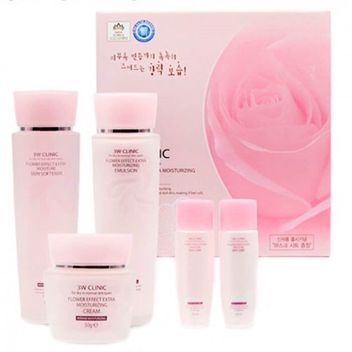 Набор увлажняющей косметики с цветочными экстрактами 3W Clinic Flower Effect Extra Moisturizing 3 Kit Set подходит для любого типа кожи, но в особенности для сухой и обезвоженной кожи.